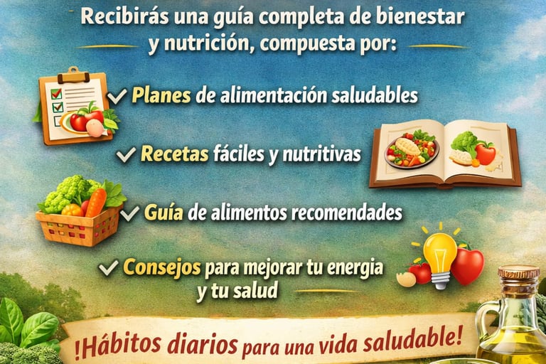 Recibirás una guía completa de bienestar y nutrición, compuesta por contenidos visuales, recetas prácticas y explicaciones paso a paso sobre los principales pilares de una alimentación saludable: